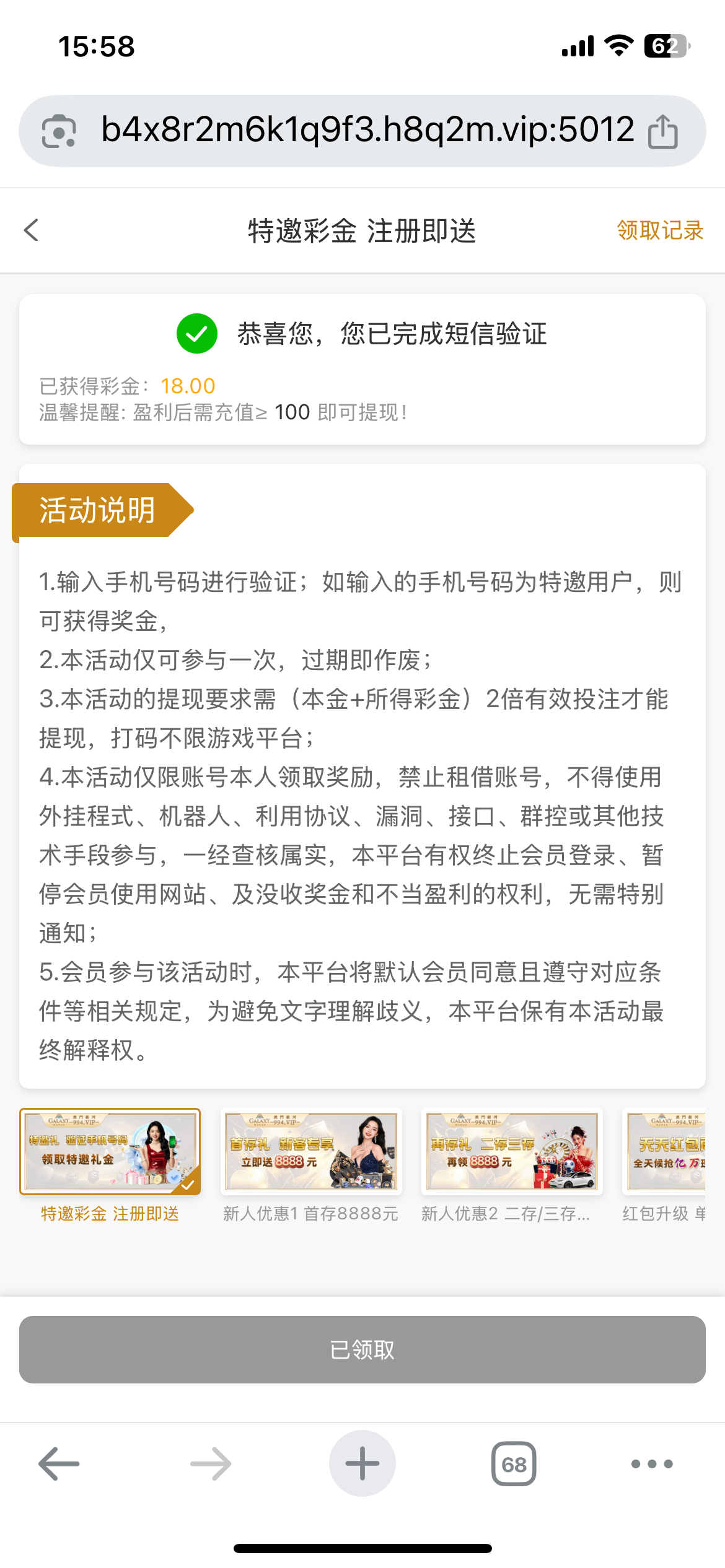 注册绑定手机号自助领取,盈利需要充100